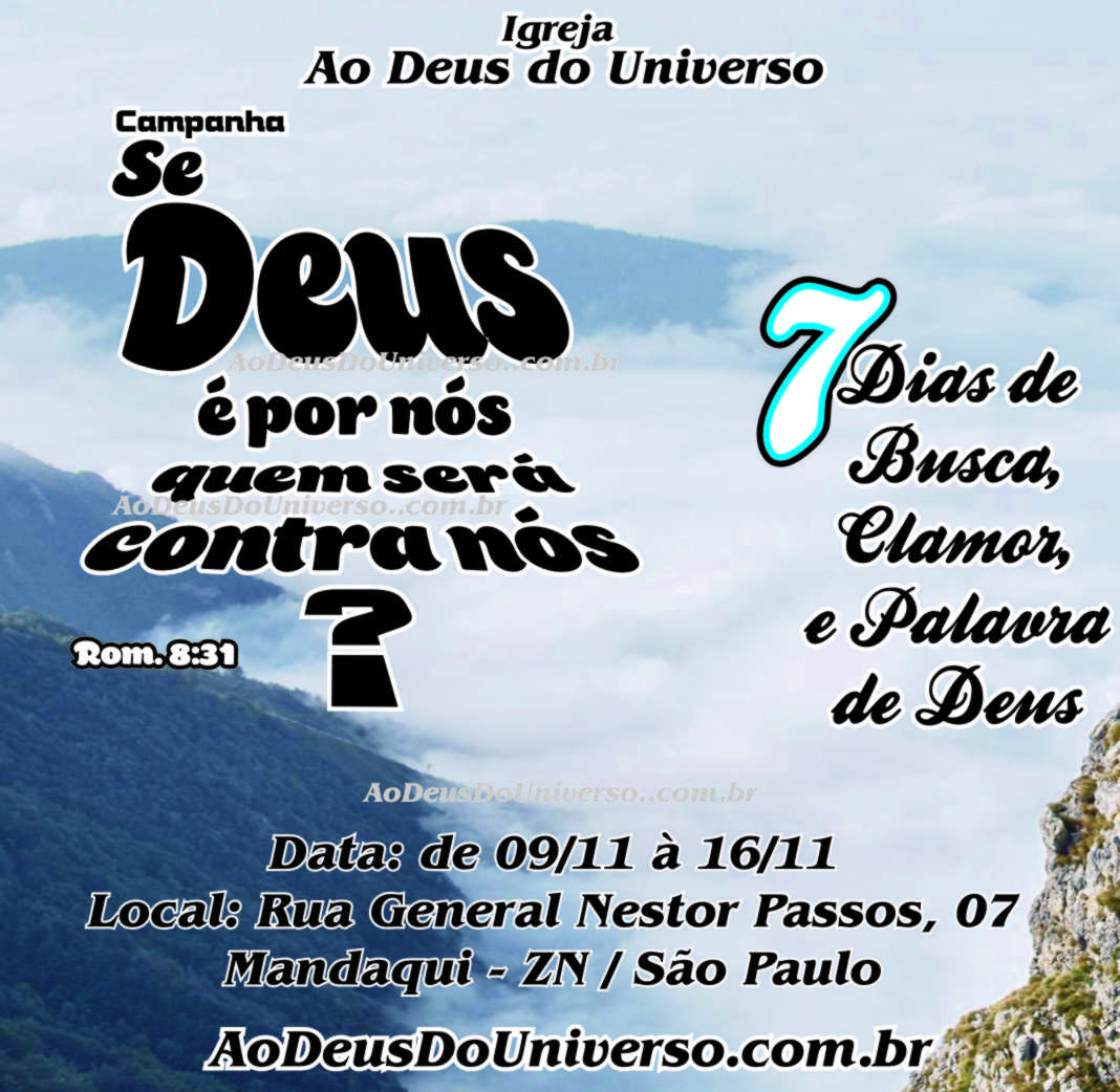 Queridos e Amados irmãos e irmãs, e com grande alegria que anunciamos que a Igreja Ao Deus do Universo, na direção do Espírito Santo, usando a Pastora Creusa Strelle e o Pastor Daniel Strelle, convidam a todos para mais uma Campanha de 7 dias : Campanha Se Deus é por nós, quem será contra nós?